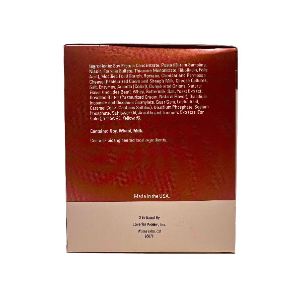 Soy Protein Concentrate, Pasta (Durum Semolina [From Wheat], Niacin, Ferrous Sulfate, Thiamine Mononitrate, Riboflavin, Folic Acid), Romano, Cheddar and Parmesan Cheese (Pasteurized Cow’s and Sheep’s Milk, Cheese Cultures, Salt, Enzymes, Annatto [Color]), Modified Food Starch, Dehydrated Onions, Natural Flavor (Includes Beef), Whey, Buttermilk, Yeast Extract, Salt, Disodium Inosinate and Disodium Guanylate, Guar Gum, Sodium Phosphate, Lactic Acid, Caramel Color (Contains Sulfites), Disodium Phosphate, Safflower Oil, Yellow #5, Yellow #6.