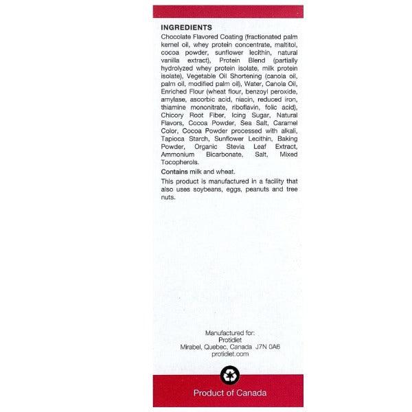 Chocolate Flavored Coating (Fractionated Palm Kernel Oil, Whey Protein Concentrate, Maltitol, Cocoa Powder, Sunflower Lecithin, Natural Vanilla Extract), Protein Blend (Partially Hydrolyzed Whey Protein Isolate, Milk Protein Isolate), Vegetable Oil Shortening (Canola Oil, Palm Oil, Modified Palm Oil), Water, Canola Oil, Enriched Flour (Wheat Flour, Benzoyl Peroxide, Amylase, Ascorbic Acid, Niacin, Reduced Iron, Thiamine Mononitrate, Riboflavin, Folic Acid), Chicory Root Fiber, Icing Sugar, Natural Flavors, Cocoa Powder, Sea Salt, Caramel Color, Cocoa Powder processed with Alkali, Tapioca Starch, Sunflower Lecithin, Baking Powder, Organic Stevia Leaf Extract, Ammonium Bicarbonate, Salt, Mixed Tocopherols. Contains: Milk and Wheat. This product is manufactured in a facility that also uses Soybeans, Eggs, Peanuts and Tree Nuts.