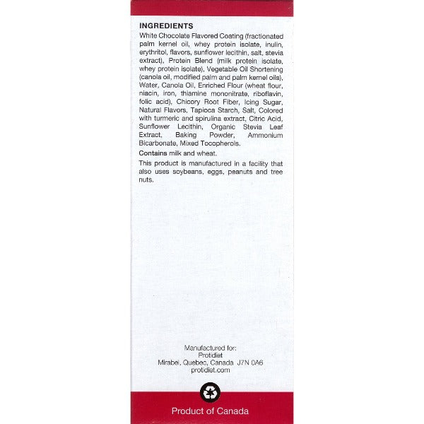White Chocolate Flavored Coating (Fractionated Palm Kernel Oil, Whey Protein Isolate, Inulin, Erythritol, Flavors, Sunflower Lecithin, Salt, Stevia Extract), Protein Blend (Milk Protein Isolate, Whey Protein Isolate), Vegetable Oil, Shortening (Canola Oil, Modified Palm and Palm Kernel Oils), Water, Canola Oil, Enriched Flour (Wheat Flour, Niacin, Iron, Thiamine Mononitrate, Riboflavin, Folic Acid), Chicory Root Fiber, Icing Sugar, Natural Flavors, Tapioca Starch, Salt, Colored with Turmeric and Spirulina Extract, Citric Acid, Sunflower Lecithin, Organic Stevia Leaf Extract, Baking Powder, Ammonium Bicarbonate, Mixed Tocopherols. Contains: Milk and Wheat (gluten). This product is manufactured in a facility that also uses Soybeans, Eggs, Peanuts and Tree Nuts.