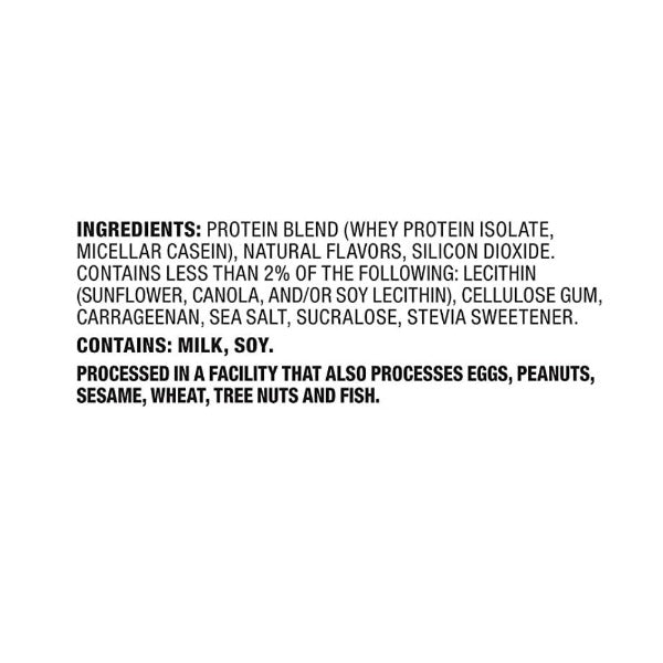 Protein Blend (Whey Protein Isolate, Micellar Casein), Natural Flavors. Contains Less Than 2% Of The Following: Sea Salt, Sunflower Lecithin, Cellulose Gum, Carrageenan, Silicon Dioxide, Sucralose, Steviol Glycosides (Stevia). Contains: Milk. Processed in a facility that also processes Eggs, Peanuts, Soy, Wheat, Tree Nuts and Fish.