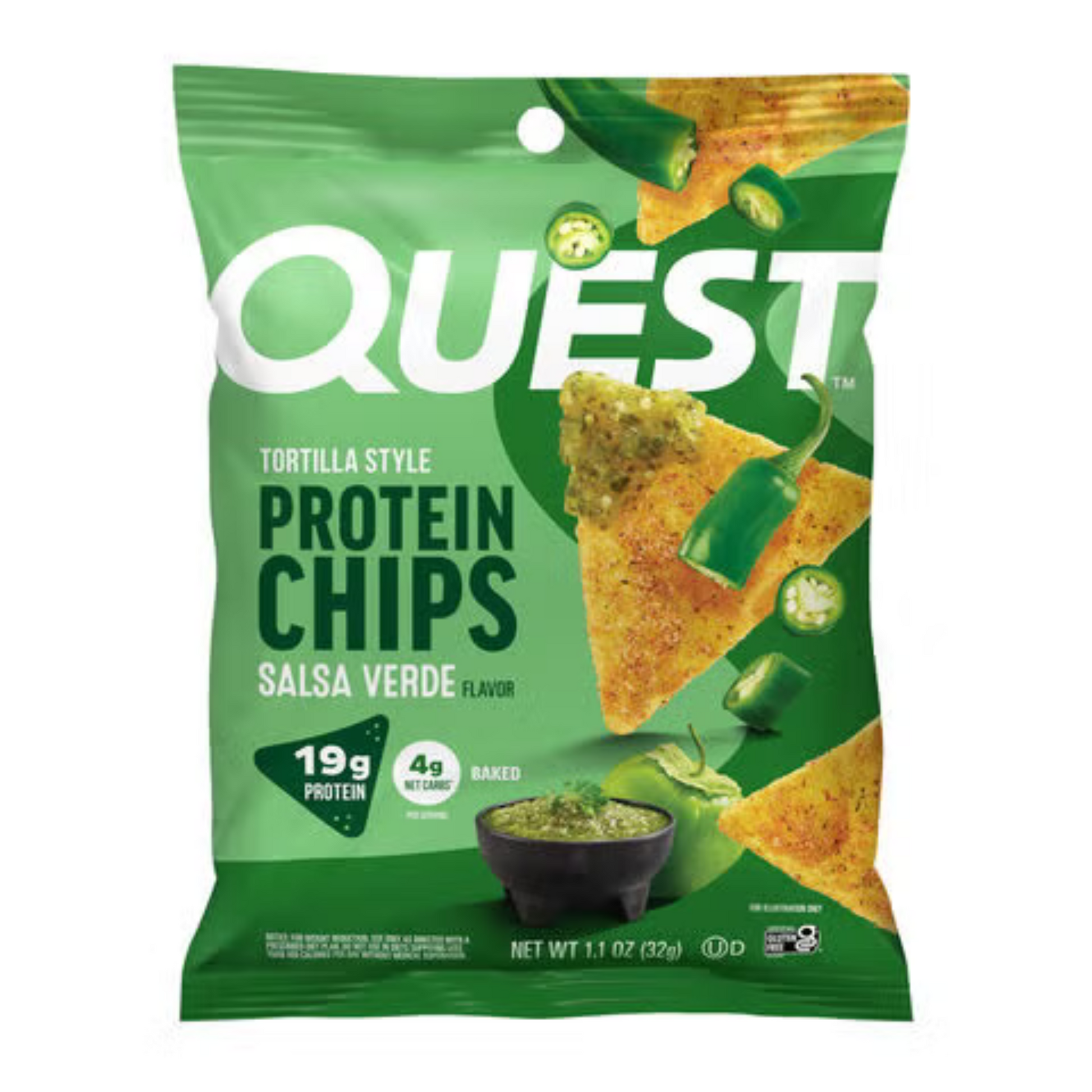Indulge in the newest Quest Protein Tortilla Chips - Salsa Verde! With 19g of protein, 4g net carbs, and 1g of sugar, these baked chips offer not just a satisfying crunch but also a guilt-free snacking experience. Get ready to relive the classic taste of spicy Salsa Verde with every bite. Don't miss out on this amazing gluten free snack!