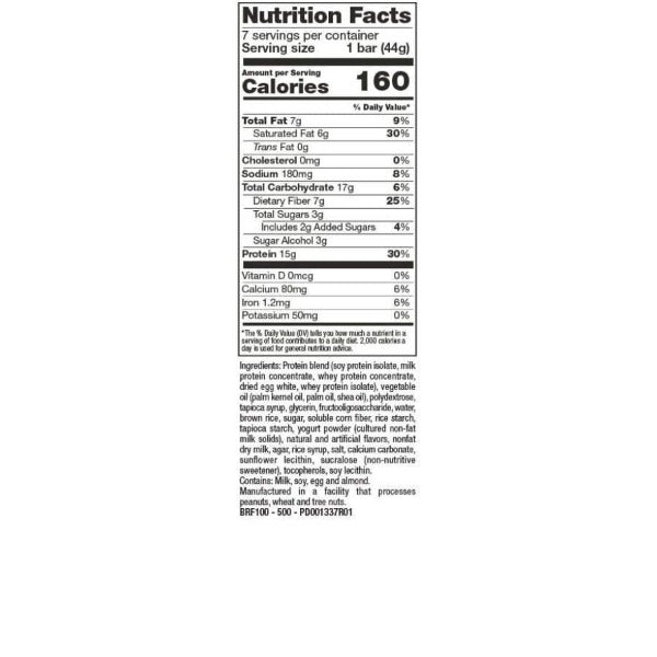 Protein Blend (Soy Protein Isolate, Milk Protein Concentrate, Whey Protein Concentrate, Dried Egg White, Whey Protein Isolate), Vegetable Oil (Palm Kernel Oil, Palm Oil, Shea Oil), Polydextrose, Tapioca Syrup, Glycerin, Fructooligosaccharide, Water, Brown Rice, Sugar, Soluble Corn Fiber, Rice Starch, Tapioca Starch, Yogurt Powder (Cultured Non-Fat Milk Solids), Natural and Artificial Flavors, Nonfat Dry Milk, Agar, Rice Syrup, Salt, Calcium Carbonate, Sunflower Lecithin, Sucralose (Non-Nutritive Sweetener), Tocopherols, Soy Lecithin. Contains: Milk, Soy, Egg, and Almond. Manufactured in a facility that processes Peanuts, Wheat and Tree Nuts.