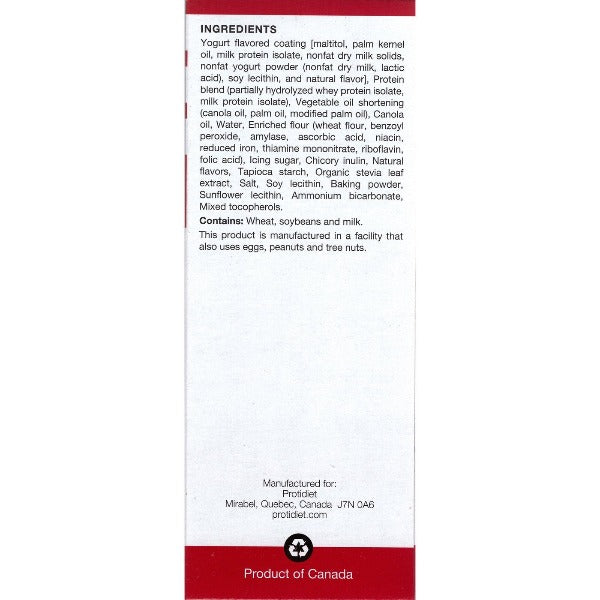 Yogurt Flavored Coating (Maltitol, Palm Kernel Oil, Milk Protein Isolate, Nonfat Dry Milk Solids, Nonfat Yogurt Powder [Nonfat Dry Milk, Lactic Acid], Soy Lecithin, and Natural Flavor), Protein Blend (Partially Hydrolyzed Whey Protein Isolate, Milk Protein Isolate), Vegetable Oil Shortening (Canola Oil, Palm Oil, Modified Palm Oil), Canola Oil, Water, Enriched flour (Wheat Flour, Bensoyl Peroxide, Amylase, Ascorbic Acid, Niacin, Reduced Iron, Thiamine Mononitrate, Riboflavin, Folic Acid), Icing Sugar, Chicory inulin, Natural Flavors, Tapioca Starch, Organic Stevia Leaf Extract, Salt, Soy Lecithin, Baking Powder, Sunflower Lecithin, Ammonium Bicarbonate, Mixed Tocopherols. Contain: Wheat, Soybeans and Milk. This product is manufactured in a facility that also uses Eggs, Peanuts and Tree Nuts.